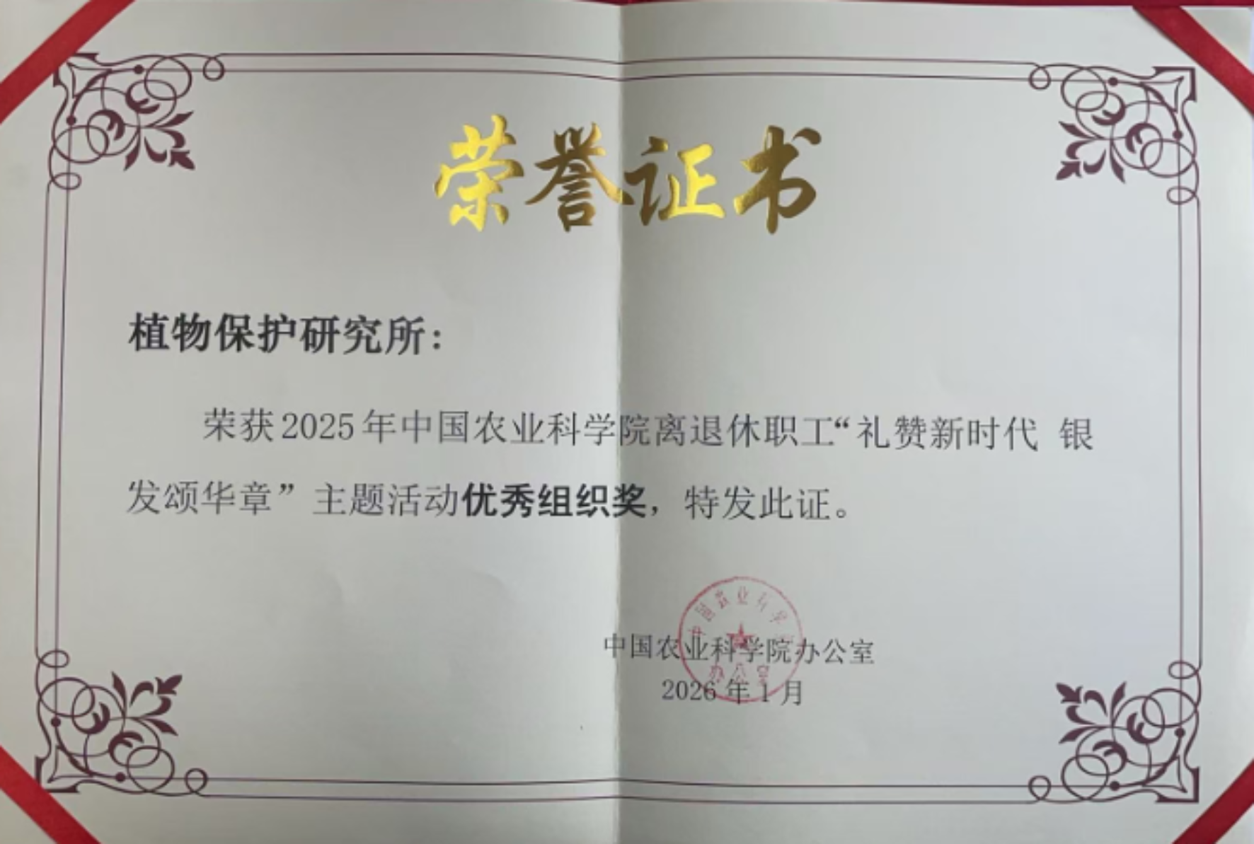 2月10日,中国农科院举办离退休职工春节团拜会,会议表彰了“礼赞新时代银发颂华章”主题活动优秀组织单位及作品。植保所荣获优秀组织奖,纪委书记刘水长代表植保所上台领奖。