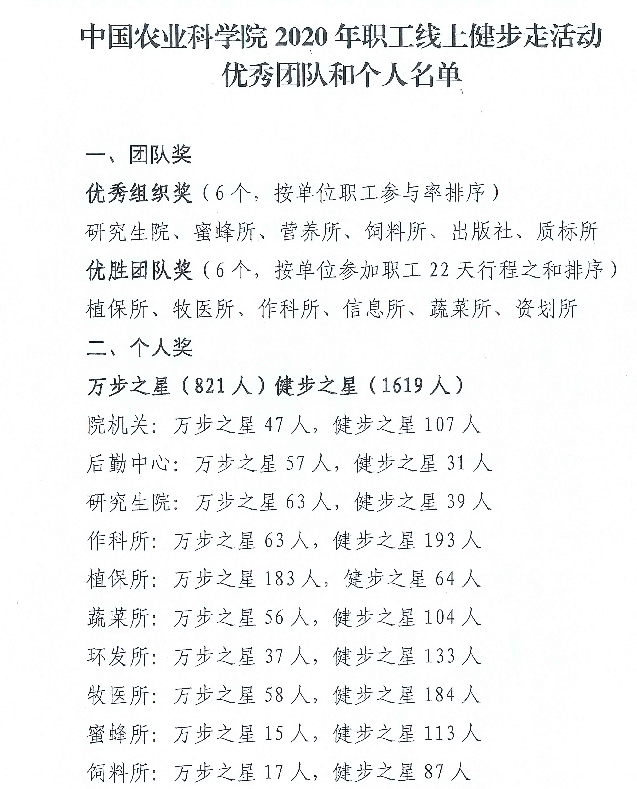 2021年1月8日,中国农业科学院工会印发通知,对全院京区单位2020年“科学防疫,同心奋进”职工线上健步走活动中表现优秀的团队和个人进行表彰奖励。植保所喜获优胜团队奖第一名,183人获得“万步之星”奖励称号,获奖人数位居全院第一,且遥遥领先全院其他参加单位。