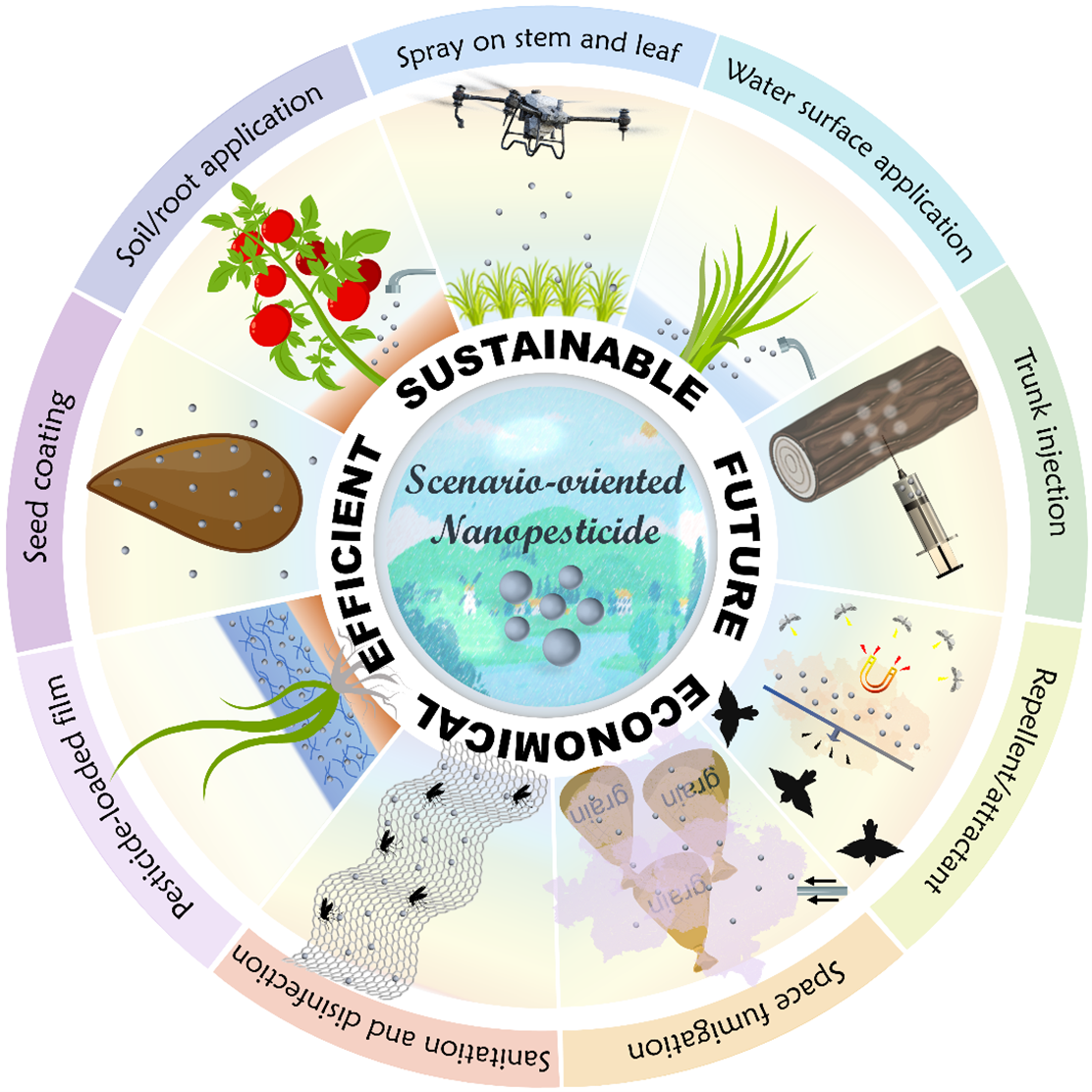 Given the diversity and complexity of agricultural production, pesticide application scenarios and methods should also be diverse. Therefore, the development strategy of scenario-oriented nanopesticides, which involves designing tailored formulations for different application scenarios, aligns better with the trends in modern agriculture. The paper emphasized that future nanopesticide development should prioritize typical pesticide application scenarios, such as spray on stem and leaf, soil/root application, water surface application, seed coating, trunk injection, space fumigation, repellent/attraction, sanitation and disinfection, and pesticide-loaded mulch films. Targeted formulation design for these different scenarios is crucial to enhance the sustainable development potential and resource efficiency of nanopesticide products.