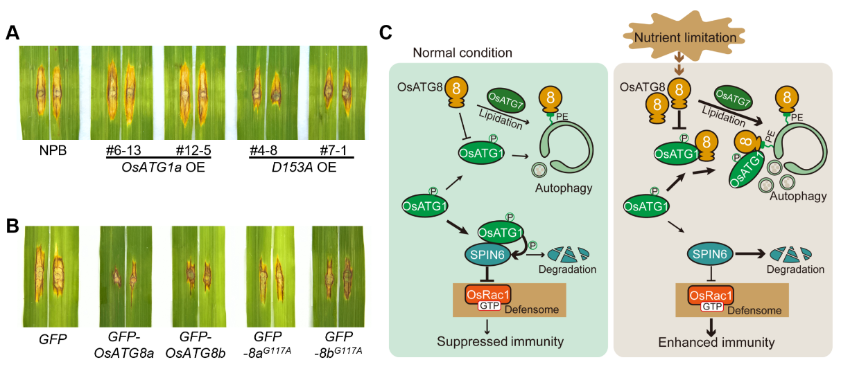 The study demonstrated that two core autophagy proteins OsATG1 and OsATG8 in rice oppositely regulate the ROP GTPase-mediated immunity independent of the autophagy pathway. Specifically, OsATG1 phosphorylates the Rho GTPase-activating protein (RhoGAP) SPIN6, which enhances immune suppression by inactivating the ROP GTPase OsRac1 signaling. By contrast, OsATG8 competitively disrupts the OsATG1–SPIN6 complex, releasing SPIN6 inhibition and activating immunity; interestingly, the non-lipidated form of OsATG8 retained this competition ability and promotes rice immunity independent of autophagy. Further research revealed that rice immunity and the OsATG8 protein are induced under nutrient limitations, while SPIN6 is degraded. The OsATG1-mediated phosphorylation of SPIN6 blocks the nutrient limitation-induced immunity. This establishes a direct molecular link between nutritional status and immune activation, whereby the OsATG8–OsATG1–SPIN6 module responds dynamically to nutrient stress to fine-tune rice defense strategies.
