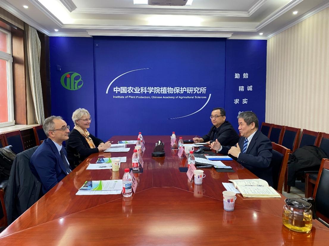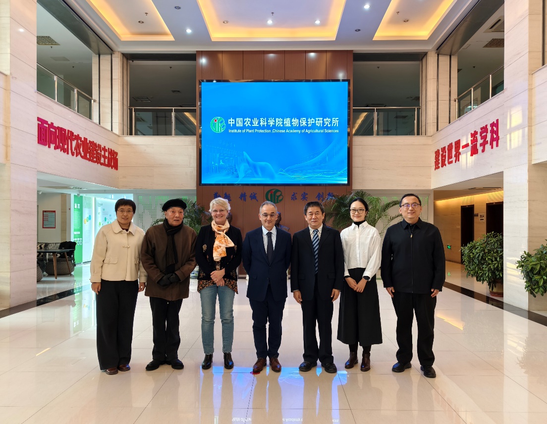 12月5日,2025年度中法植物保护国际联合实验室交流座谈会在植保所召开。法国国家农业食品与环境研究院(INRAE)驻华办事处首席代表马大卫(David Makowski)先生、前首席代表李政先生、植保所副所长张杰研究员、联合实验室法方主任、INRAE生态与环境科学研究所艾曼纽•雅克昆-乔利(Emmanuelle Jacquin-Joly)教授和植保所相关专家出席会议。座谈会由植保所交流合作处副处长田芳主持。