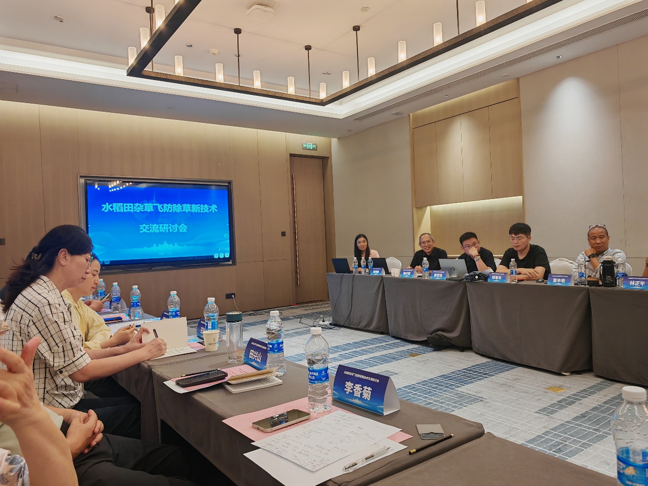 专家团首先前往增城试验基地,实地查看无人机飞防除草效果,并观摩无人机大雾滴喷雾技术和产品演示。数据显示,使用氧氟草酯+五氟磺草胺配合0.5%~1%飞防助剂,对稻田杂草防治效果高达96.8%,防治效果与作业效率均优于传统施药方式。随后,专家团听取了科研团队技术研发汇报。该项技术由植保所自主研发,重点突破了除草剂飞防过程中雾滴易飘移、分布不均等技术瓶颈。通过使用大雾滴(粒径可达800 μm)配合专用水面高扩散飞防助剂IPP-6和IPP-R1,有效降低了除草剂雾滴飘移风险,且实现了除草剂在水面的均匀分散。该技术既可适用于封闭处理,也可用于茎叶喷雾处理,操作简便,省工省力。