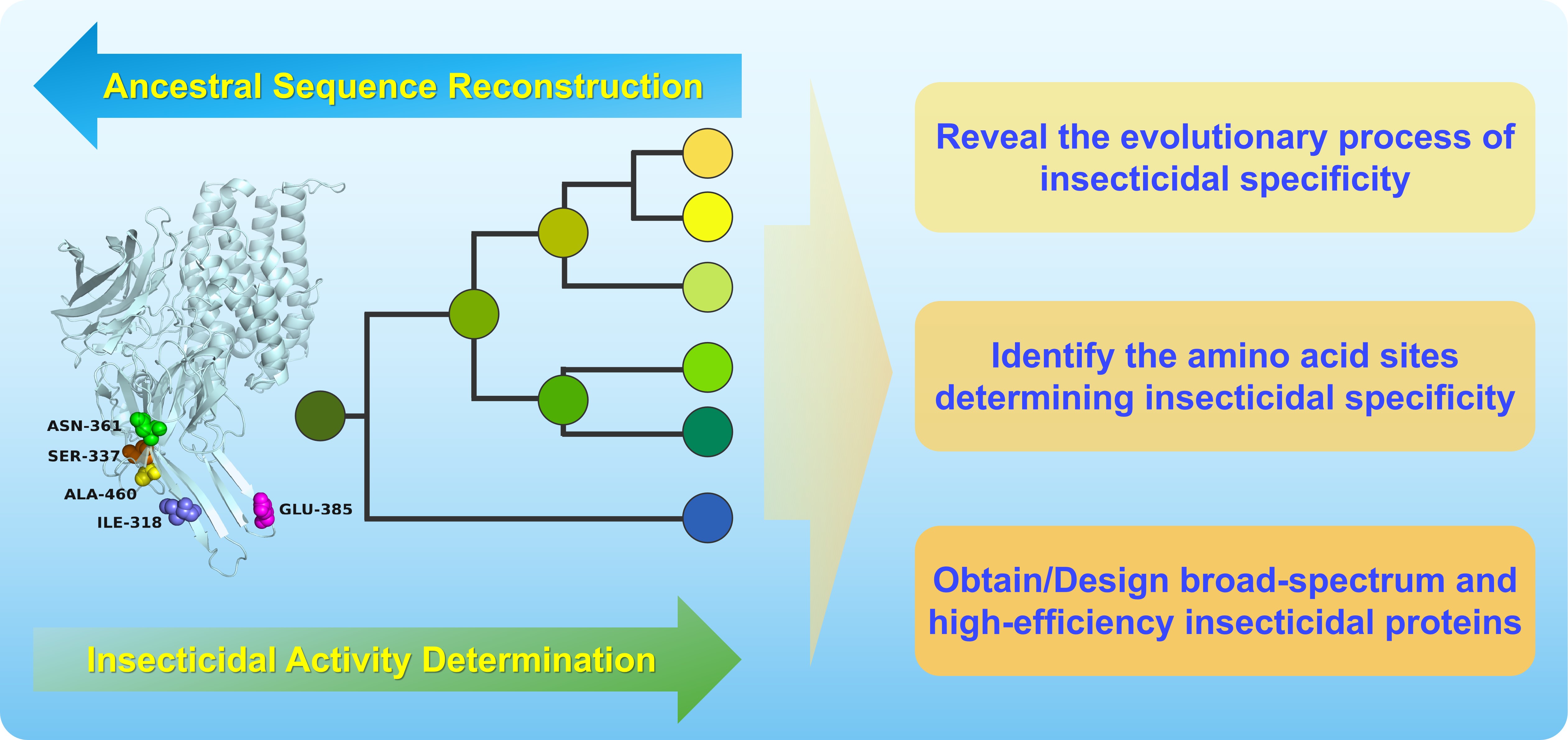 近日,我所抗虫功能基因研究与利用创新团队联合安徽农业大学在Bt杀虫蛋白研究领域取得突破性进展,相关研究成果以题为“Resurrecting the past: Ancestral Bacillus thuringiensis pesticidal proteins reveal broad-spectrum insecticidal activity and protein engineering hotspots”发表于国际知名学术期刊《Science Bulletin》(影响因子IF=21.1)。该研究采用祖先序列重建技术,追溯Bt杀虫蛋白活性演变历程,发掘高效杀虫蛋白及关键功能位点,成功设计出高效广谱新型杀虫蛋白,为该领域研究提供新范式(图1)。