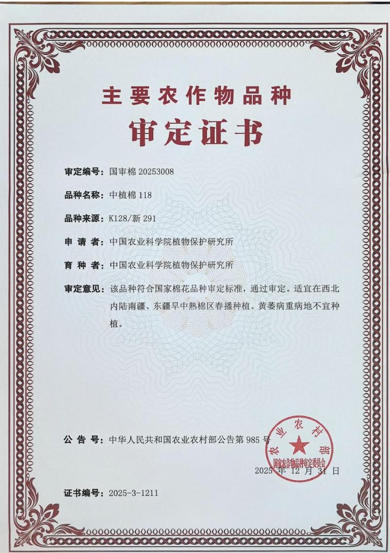 日前,由中国农业科学院植物保护研究(以下称植保所)所选育的棉花新品种“中植棉118”顺利通过国家农作物品种审定委员会审定,审定编号:国审棉20253008。该品种是植保所联合中国农业科学院新乡有害生物防治野外科学观测试验站依并依托联合体参试渠道获得国审资格的首个棉花品种,标志着植保所棉花抗病虫常规育种研究取得新突破。