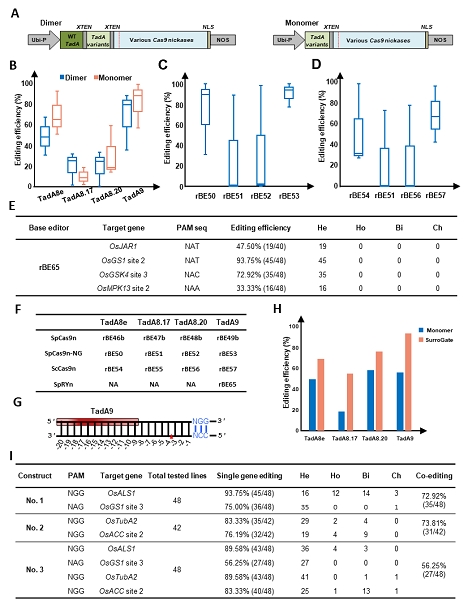 为了实现对现有植物腺嘌呤碱基编辑器的优化升级,该团队研究人员对TadA7.10衍生版本进行了评估,并在此基础之上开发出全新版本TadA9。进一步采取TadA单体策略以及整合SurroGate系统,多个测试靶位点处的碱基编辑效率逐步提高至90%以上,基本类似于CRISPR技术进行靶基因敲除的表现。