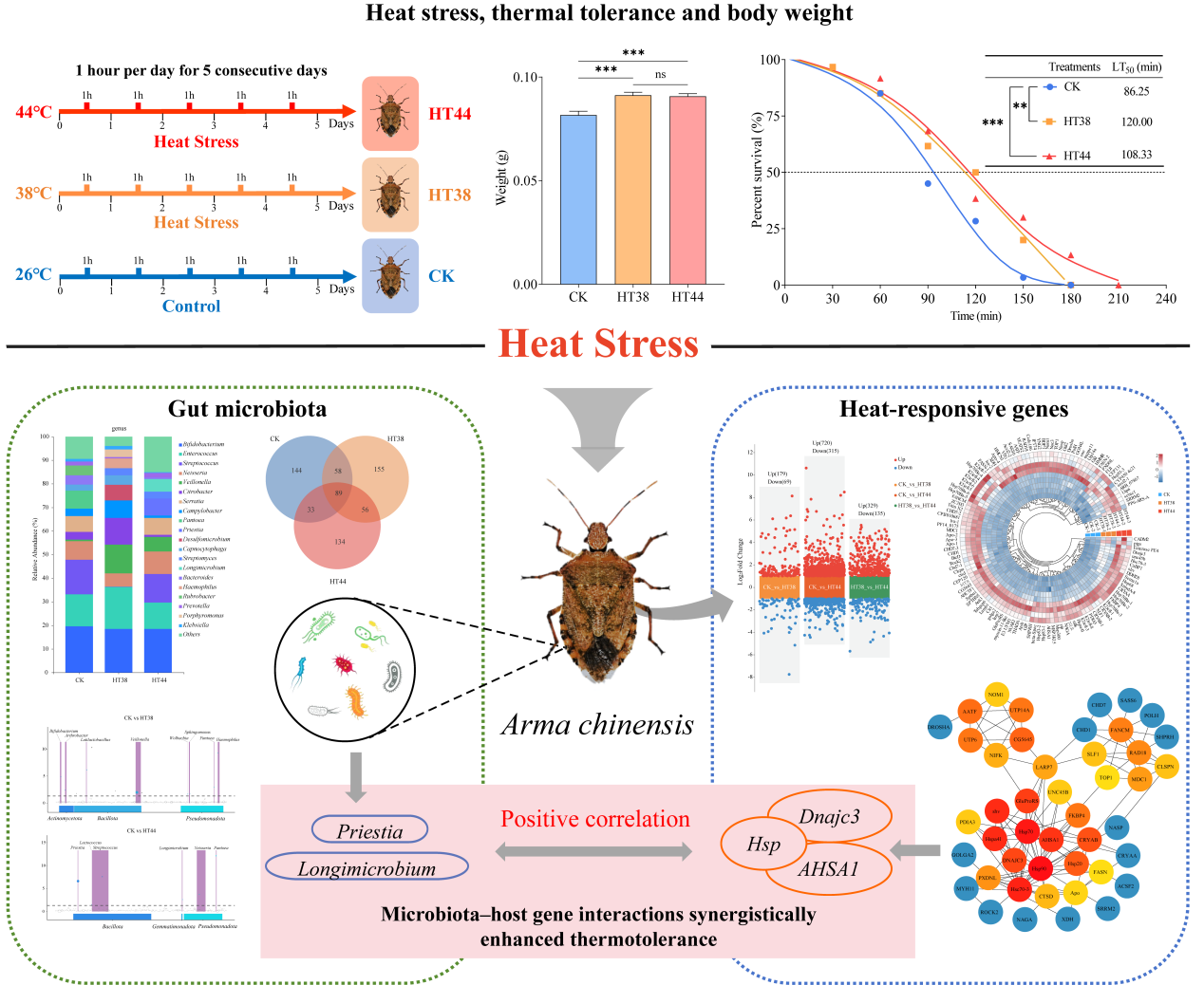 该研究以蠋蝽为对象,设置38℃和44℃两个高温处理组,每日处理1小时,连续处理5天。研究发现,短期热胁迫后蠋蝽体重显著增加,同时耐热能力明显提升,中致死时间(LT50)从对照组的86.25分钟延长至120.00分钟。通过16S rRNA测序分析肠道活性菌群,发现热胁迫诱导了菌群结构的显著变化,其中Priestia和Longimicrobium等菌属在高温处理组中丰度显著升高。转录组测序进一步鉴定了121个关键热响应基因,包括热激蛋白(Hsp20、Hsp70、Hsp90家族)及与蛋白质稳态、DNA修复、代谢重编程相关的基因。通过加权基因共表达网络分析(WGCNA),研究确定了以CRYAA为核心的枢纽基因模块。整合相关性分析显示,特定微生物类群与宿主转录响应之间存在显著关联。