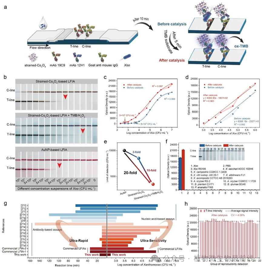 该研究首先成功制备了具有显著原子压缩应变(εxx = −3.34%, εyy = − 6.52%)的Co3O4纳米酶。通过原子位移分析确定了原子级位移方向与距离,为密度泛函理论计算建模提供了详细依据。研究发现,应变工程提高了晶体场分裂能,促使Co3O4从低自旋态(t2g6eg0)向高自旋态(t2g4eg2)转变,从而实现高效的单电子转移性能。自旋态调控显著增强了Co3O4类过氧化物酶催化效率,其米氏常数(Km)对TMB和H2O2分别比原始Co3O4降低了28.0倍和11.8倍。同时,阐明了应变-自旋轨道-类过氧化物酶活性之间的相关性机制,为设计高性能纳米酶提供新的策略。此外,该应变Co3O4纳米酶已作为检测探针成功应用于水稻白叶枯病菌新型免疫层析试纸条开发,创制试纸条的检测灵敏度达到5×102 CFU mL−1,比胶体金免疫层析试纸条高20倍,比商用免疫层析试纸条灵敏度高2-3个数量级,从而为水稻白叶枯病菌的检测与防控提供强有力的工具。