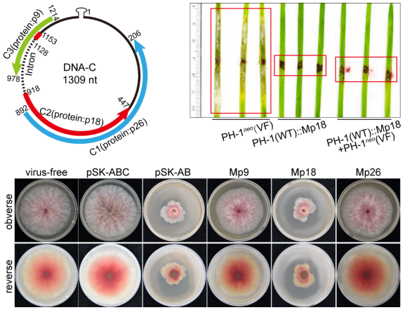 FgGMTV1是由该团队从小麦赤霉病菌中鉴定出的世界首个真菌多组分DNA病毒,属于类双生病毒科。该病毒包含三个环状单链DNA分子:DNA-A、DNA-B和DNA-C。先前的研究已经表明,含有DNA-C组分的病毒对寄主禾谷镰孢菌的表型无影响,而不含DNA-C组分的病毒则能够减弱寄主的致病性。这暗示了DNA-C组分在决定病毒无症状侵染方面起着关键作用。