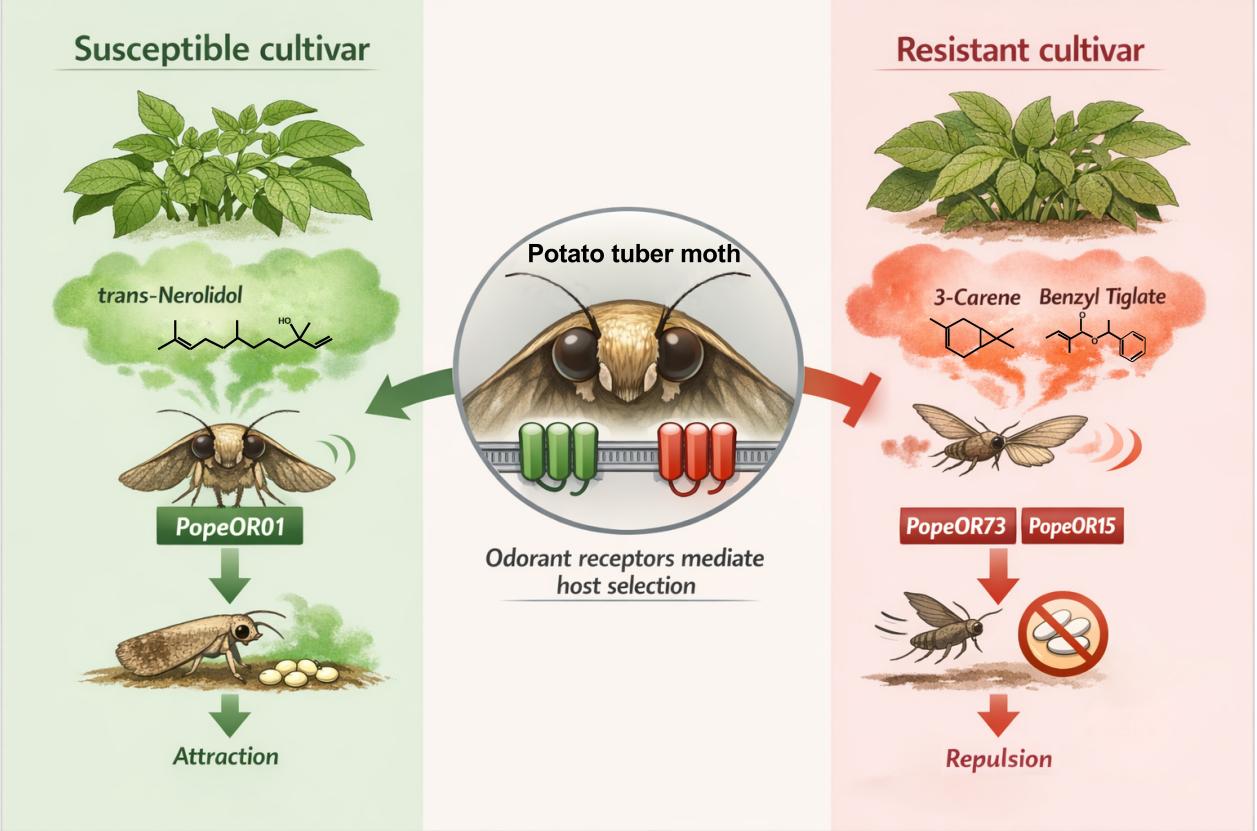 近日,中国农业科学院植物保护研究所经济作物虫害监测与防控创新团队联合国内外科研团队,在国际著名综合性期刊《Proceedings of the National Academy of Sciences of the United States of America》(PNAS)在线发表题为“Semiochemicals and odorant receptors underlying potato cultivar susceptibility and resistance to potato tuber moth”的研究论文。该研究系统揭示了不同马铃薯品种挥发物差异如何通过特异性气味受体调控马铃薯块茎蛾的寄主选择行为,从分子水平阐明了马铃薯块茎蛾差异化识别寄主化学通讯机制,为构建基于品种本身或信息化学物质的“推-拉”绿色防控体系提供了分子靶标和理论基础。