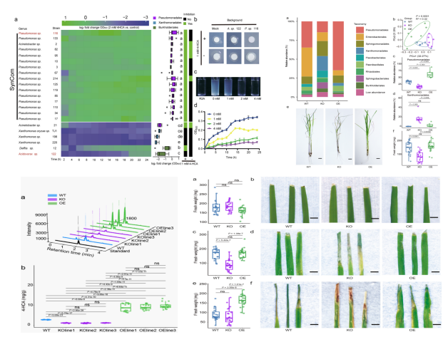 陆地生态系统中,植物叶片为微生物群落提供了最大的生物栖息地,各种有益微生物和潜在病原微生物均共存于植物叶际,相对稳定的叶际微生物群落结构对维持宿主植物健康生长至关重要,对维持农作物的抗病性也至关重要。虽然宿主植物驱动叶际微生物组装的现象广泛存在,但目前对其机制仍然未知。为了解析农作物宿主驱动叶际微生物组装的机制,本合作团队前期完成了国际水稻遗传多样性群体(包含110个品种)的叶际微生物宏基因组测序及组装(Su, et.al., Scientific Data , 2022),为叶际微生物研究提供了数据资源。本研究中,通过对数据深度挖掘,定性了水稻叶际细菌种类近7000个,同时定量了各个种在110个水稻叶际的丰度值;进而通过开发生物信息学分析方法,对近7000个叶际微生物富集丰度值与110个水稻品种的单核苷酸多态性标记(SNPs)进行全基因组关联分析(GWAS),共鉴定到2,667 个SNPs与496种叶际微生物丰度存在关联,这些SNPs在水稻染色体上富集成235个位点(图1)。对235个位点包含的基因进行代谢通路分析,发现,木质素合成通路中多个基因分别与Pseudomonadales, Burkholderiales, Xanthomonadales目中细菌物种的丰度紧密关联。进一步功能验证结果表明,位于水稻4号染色体的 OsPAL02 (编码1个苯丙氨酸/酪氨酸脱氨酶)基因是控制4-HCA的关键基因,4-HCA与叶际Pseudomonadales目物种的丰度呈显著正相关。对野生型水稻(对照)、 OsPAL02 基因敲除与过表达水稻的叶际微生物群体进行逐一分析揭示,4-HCA对 Pseudomonas 属有益细菌具有特异性募集功能,同时可持续抑制水稻叶际致病性细菌群体 Xanthomonas 属,进而有效遏制白叶枯病的发生(图2)。该研究系统且完整地阐明了水稻与微生物群落互作中,宿主通过代谢物4-HCA募集 Pseudomonas 属有益细菌和抑制 Xanthomonas 属有害病原细菌的遗传与分子机制。
