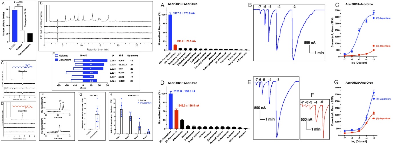 团队研究发现铜绿丽金龟的性信息素为 R-Japonilure,其行为拮抗剂为 S-Japonilure,与日本金龟子具有相似机制。利用非洲爪蟾卵母细胞功能表达系统筛选发现:AcorOR18 和 AcorOR29 对 R-Japonilure 表现高度敏感,其中 AcorOR29 同时对 S-Japonilure 也有一定响应。基因沉默与行为生测实验验证了这两个受体在性信息素识别中的关键功能。荧光原位杂交结果显示,AcorOR18 与 AcorOR29 表达于不同类型的触角感器中。单感器电生理记录进一步发现,铜绿丽金龟触角中存在两类对 R-Japonilure 敏感的感器:一类仅被 R-Japonilure 激活,另一类同时对 R-与 S-Japonilure 均有反应,分别与 AcorOR18 和 AcorOR29 的功能特性相符。为探讨丽金龟类昆虫识别机制的保守性,研究团队在日本金龟子中鉴定了与 AcorOR18 和 AcorOR29 同源的受体 PjapOR42、PjapOR37 和 PjapOR39。功能实验表明,PjapOR42 特异响应 R-Japonilure;PjapOR37 主要响应 R-Japonilure;而 PjapOR39 则对 S-Japonilure 更为敏感。该研究首次揭示了金龟子昆虫通过一对窄谱与广谱气味受体协同识别性信息素及其行为拮抗剂的分子框架,不仅解答了昆虫化学生态学中关于手性识别的关键科学问题,也为发展基于信息素的高选择性害虫治理技术奠定了重要理论基础。
