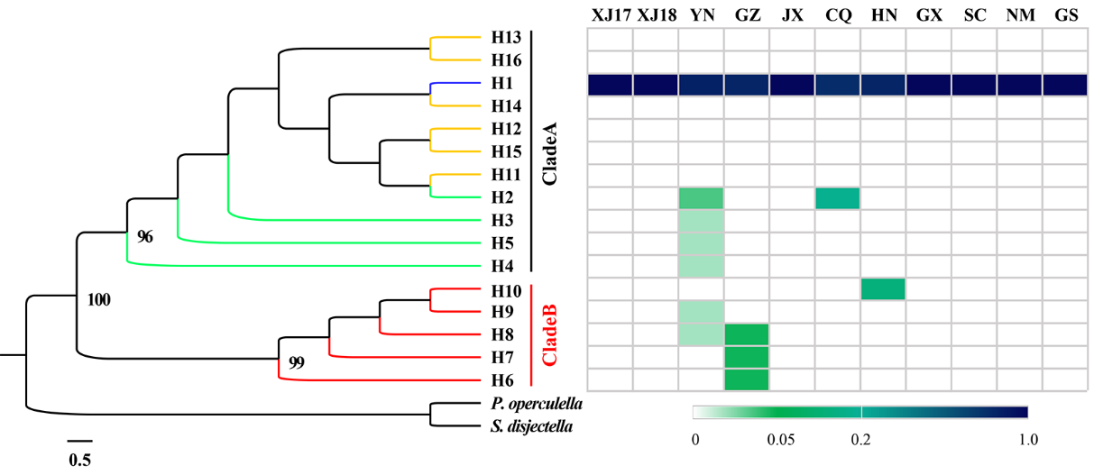 本研究对我国52个番茄潜叶蛾地理种群进行了种群遗传多样性、扩散规律和种群遗传结构进行分析,同时结合全球以发表相关结果进行综合分析,明确了其入侵路径和种群扩张趋势。结果表明,全球番茄潜叶蛾形成了两个独立的系统发育分支,其中CladeA广泛分布,而Clade B仅在我国南方入侵种群中发现。整体而言,番茄潜叶蛾全球种群具有较高的遗传同质性,但是我国种群表现出了一定的遗传分化和遗传结构差异,特别是南方种群。此外,我国的番茄潜叶蛾西北区组与南方区组间遗传分化较显著,区组内不存在显著遗传分化,而云南种群与其他种群间具有较高的基因交流。结合团队多年田间持续调查监测结果,证实入侵我国的番茄潜叶蛾种群来自新疆和云南两个不同的路径,新疆和云南的番茄潜叶蛾种群在该虫进一步扩散中发挥了桥头堡作用。研究结果为进一步阐明番茄潜叶蛾的种群扩张机制提供了理论基础,也为科学管控番茄潜叶蛾提供了参考。