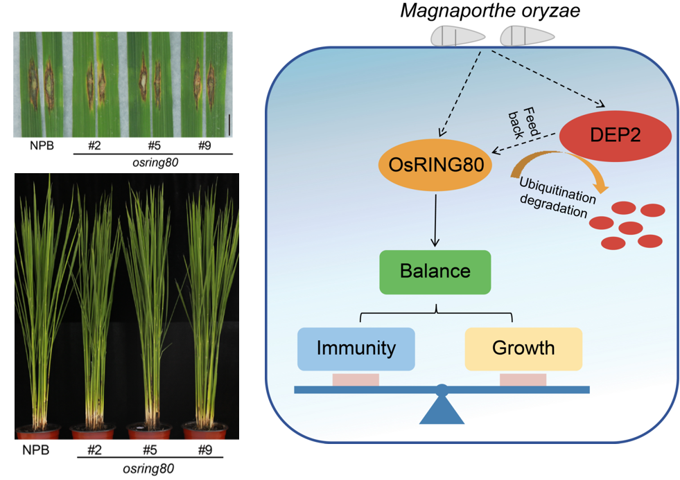 近日,中国农业科学院植物保护研究所作物病原生物功能基因组研究创新团队在《植物生理学》Plant Physiology上在线发表了题为“Balancing rice blast resistance and growth through suppression of the E3 ubiquitin ligase OsRING80”的研究论文,该研究报道了水稻E3泛素连接酶OsRING80通过调控DENSE AND ERECT PANICLE 2(DEP2)蛋白稳定性,平衡稻瘟病抗性与生长发育的新机制。