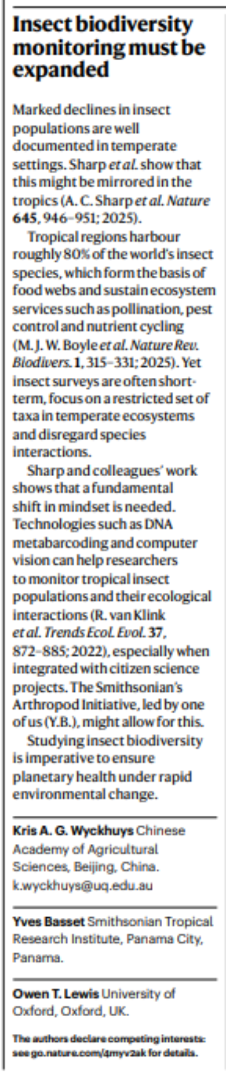Insect biodiversity monitoring must be expanded.  Wyckhuys, KAG ; Basset, Y ; Lewis, OT