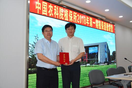 报告会结束后,周雪平所长为刘丹阳副局长颁发了演讲嘉宾证书。此次道德讲堂对于我所广大职工是一次精神激励,作为新时代的科研工作者和科研管理人员,我们要勇担时代使命,加强农业科技创新,不忘初心,牢记使命,在服务“三农”事业中建功立业。
