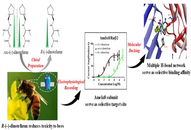 新烟碱类农药成为全球用量最大的杀虫剂品种,对全球重要媒介昆虫蜜蜂的高毒问题日益凸显,成为威胁全球农业环境生物安全的重大科学难题。欧盟宣布从2013年7月1日起对新烟碱类农药实施限用政策,以降低或避免对蜜蜂等传粉昆虫的危害。然而,开发一种高效农药往往历经多年,耗资上亿美元。如何在保留新烟碱类杀虫剂对靶标害虫高效性的同时,降低对蜜蜂等传粉昆虫的毒性是急需解决的重要科学问题。本研究从手性对映体角度入手,以第三代新烟碱类手性农药呋虫胺为代表,发现并证实该农药杀虫活性主要来自于 R -(–)-呋虫胺对映体,而对意大利蜜蜂的毒性主要来自于 S -(+)-呋虫胺对映体;通过将离子通道mRNA经体外转录后注射到非洲爪蟾卵母细胞,明确了呋虫胺对映体对害虫和蜜蜂的毒性选择性差异源自烟碱型乙酰胆碱受体(nAChRs)的α8亚基;再通过分子对接结合同源模建,进一步明确了 S -(+)-呋虫胺中-NO2与靶标受体亚基B链精氨酸173残基间的三重氢键作用力是导致 S -(+)-呋虫胺与α8功能位点结合稳定性增强的主要原因,研究结果揭示了 S -(+)-呋虫胺对意蜂高毒性的分子机制。建议研发 R -(–)-呋虫胺的单一手性对映体农药,有效降低呋虫胺对蜜蜂种群的毒性,同时有效控制靶标害虫。