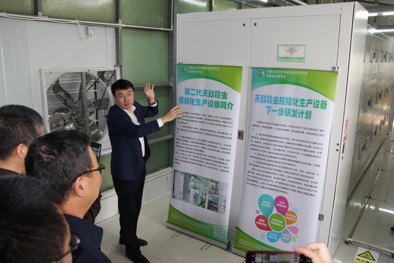 与会专家参观了中国农科院廊坊科研中试基地,现场观摩了植保所天敌昆虫产品、智能化扩繁机械、保种与扩繁实验室等。张礼生研究员就“搜集资源—大规模扩繁—延长货架期—提升定殖性”的天敌昆虫全链条科技攻关进行了详细汇报,着重介绍了天敌昆虫人工饲料的研制与优化、扩繁机械的创制、滞育调控以及天敌昆虫释放与应用技术的集成。与会领导与专家,高度评价植保所研发的天敌昆虫扩繁与利用技术、智能化扩繁机械和系列天敌昆虫产品,并对坚持问题导向、产业导向的全链条科技创新,轻简化集成天敌昆虫和有效措施解决多靶标病虫害的研究思路给予了鼓励。