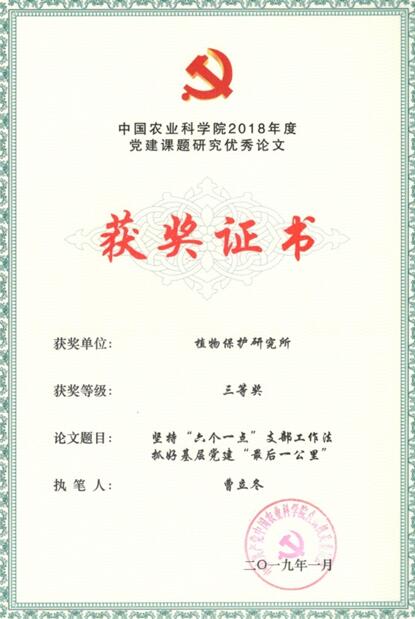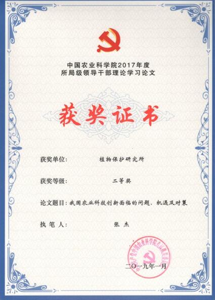 近日,在中国农科院直属机关党委组织的2017年度所局级干部理论学习论文征集活动中,张杰副所长撰写的“我国农业科技创新面临的问题、机遇及对策”荣获二等奖;在院直属机关党委组织的2018年度党建课题研究征文活动中,农药草鼠党支部曹立冬副研究员撰写的“坚持‘六个一点’支部工作法,抓好基层党建‘最后一公里’” 荣获三等奖,特此向他们表示祝贺。